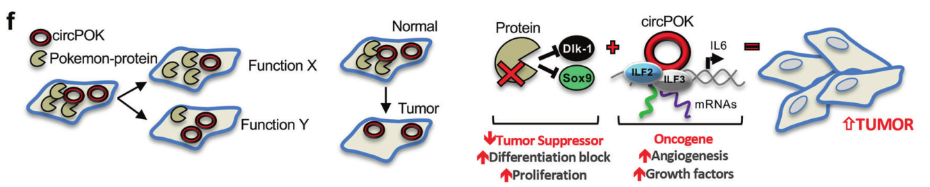 近日Pier Paolo Pandolfi教授(cell杂志2016年发表融合基因来源的circRNA具有癌基因功能的文章通讯作者)报道发现来自Zbtb7a基因(别名POKEMON)的一个circRNA与POKEMON在肿瘤中的作用方式完全相反:POKEMON基因是一种抑癌基因,而这个circRNA分子却起到类似癌基因的作用。PCR实验表明,POKEMON基因第二外显子反向剪切形一个新circRNA,命名为circPOK。后续实验表明circPOK通过共激活ILF2/ILF3复合物,诱导其下游基因表达,促进IL-6,VEGF等促增殖和血管生成因子的表达。该文详细解读请查看本公众号历史文章:Cell Research:抑癌基因来源的circRNA竟然是个癌基因