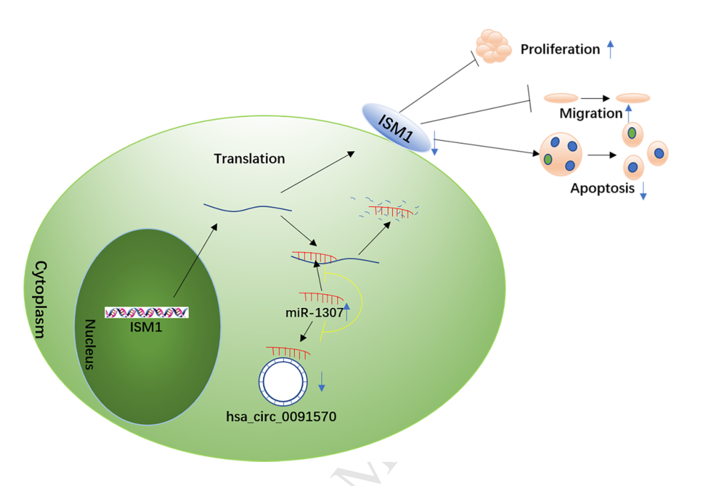 图注:HCC肝癌细胞中hsa_circ_0091570下调,导致miR-1307上调,抑制了ISM1蛋白的表达,最终促进HCC细胞增殖、迁移和抑制细胞凋亡。
