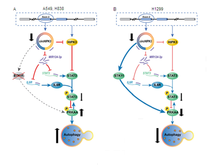 - STK11突变肺癌中环状RNA circHIPK3通过MIR124-3p-STAT3-PRKAA /AMPKα信号传导调节自噬