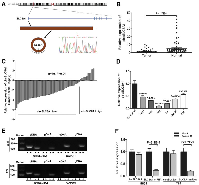 图注:qPCR等实验表明circSLC8A1在膀胱癌组织和细胞中低表达。