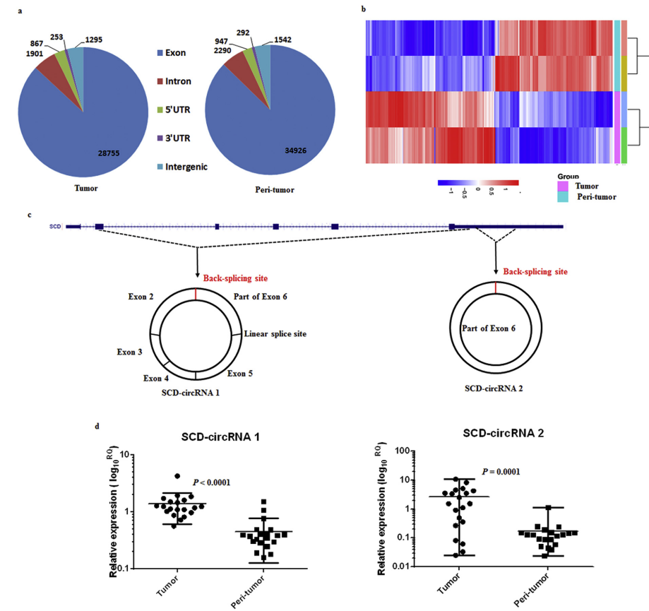 图注:RNA-seq测序和结果显示SCD-circRNA2起源自SCD基因3’UTR区,在肝癌组织中高表达。