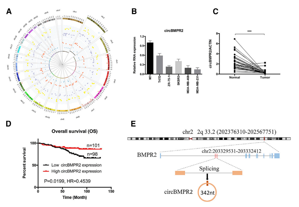 图注:circBMPR2在乳腺癌细胞和组织中显著低表达。
