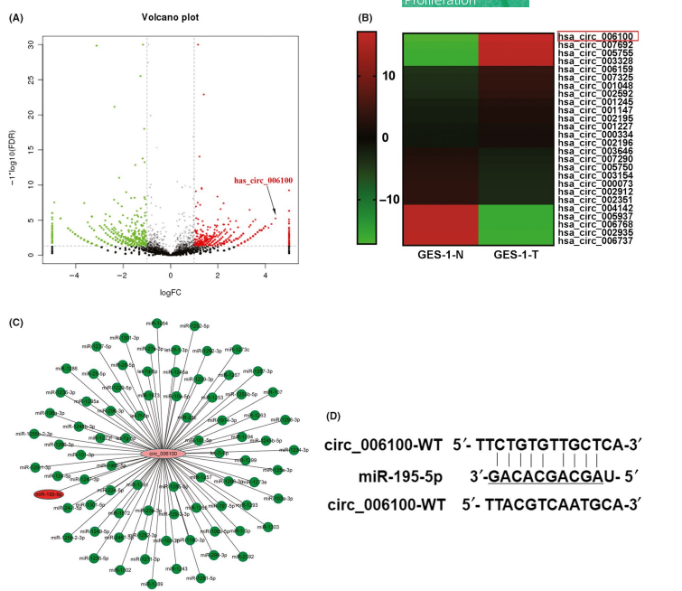 图注:hsa_circ_006100在胃癌中高表达及与miR-195-5p的结合位点。