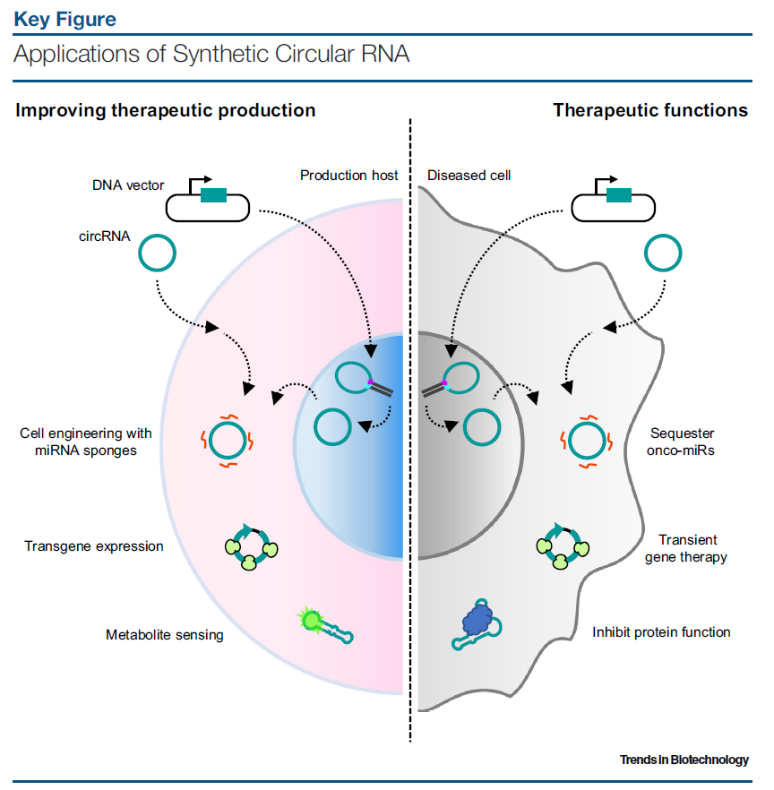 最近的研究报道,证实了合成环状RNA分子在基因治疗和基于细胞表达系统的生物制剂生产中的应用。环状RNA是前体mRNA通过反向剪接方式自然形成的共价闭环RNA。虽然环状RNA曾被认为是剪接错误的非编码产物,但现在人们普遍认为,在真核生物中,环状RNA数量丰富,在基因调控和蛋白翻译等方面具有多种功能。关于环状RNA在各种疾病中的功能及应用已有大量报道,但人工合成环状RNA在重组蛋白生产和基于环状RNA的治疗方面的应用,才刚刚成为人们关注的焦点。该综述文章系统性地阐述了目前人工合成环状RNA的应用以及合成环状RNA的方法,主要重点介绍了以下几个方面。