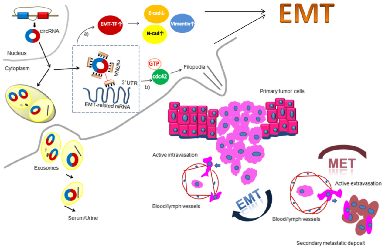 图注:circRNA在肿瘤转移中扮演重要角色,在EMT过程中,circRNA竞争性吸附miRNA会减弱miRNA对EMT相关靶基因的抑制作用,例如EMT-TF / E-cad,N-cad, vimentin(波形蛋白)和cdc42。 结果,上皮细胞丧失了细胞间粘附和细胞极性等特征,获得运动性,迁移潜力和侵袭性,成为间充质干细胞。 另外,EMT触发原发性肿瘤细胞进入循环系统或淋巴系统。 然后,循环的肿瘤细胞被转运到远处组织或器官通过EMT形成继发转移性肿瘤灶。 值得注意的是,在血清/尿液中检测到了外泌体分泌的circRNA,为癌症的诊断和治疗提供了一种新的策略。