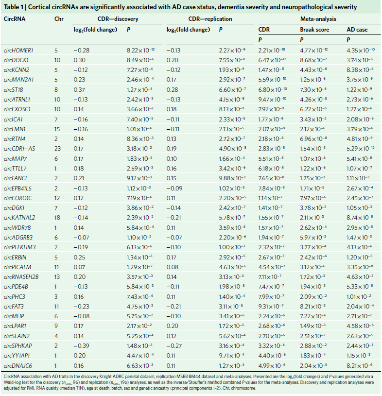 - 阿尔茨海默症患者大脑皮质中的环状RNA表达谱证明circRNA的强临床和病理学关联性。
