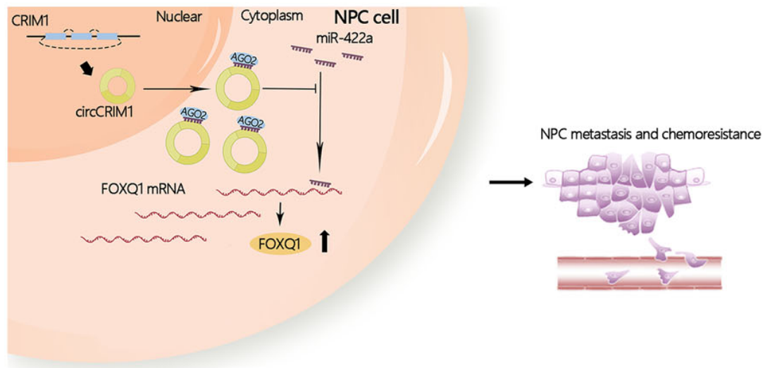 1、环状RNA CRIM1通过ceRNA作用机制上调FOXQ1促进鼻咽癌转移和多西他赛化疗耐药。