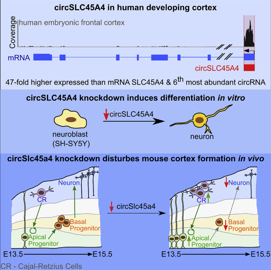 图注:高度保守的环状RNA——circSlc45a4可保持神经细胞在哺乳动物脑中的祖细胞状态