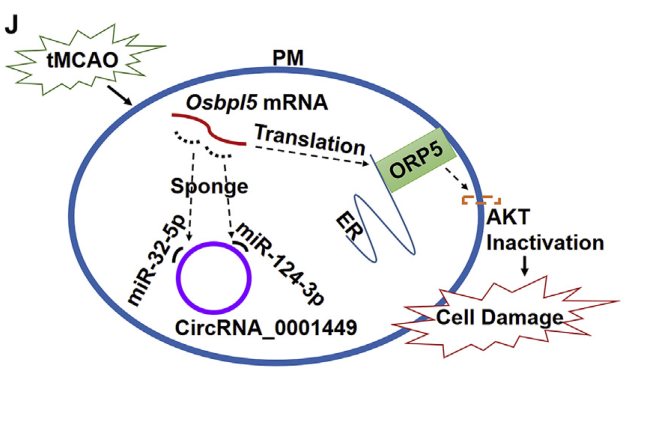 磷脂酰肌醇-3,4,5-三磷酸[PI(3,4,5)P3]是磷脂酰肌醇4-磷酸[PI(4)P]和磷脂酰肌醇4,5-2磷酸[PI(4,5)P2]的衍生物,其募集并激活质膜(PM)中的AKT以促进细胞存活。ORP5锚定在内质网(ER)-质膜(PM)接触部位,并充当PI(4)P和PI(4,5)P2 /磷脂酰丝氨酸(PS)交换剂。该研究中,对感觉运动皮层的脂质组学分析表明,短暂性脑中动脉阻塞(tMCAO)干扰了PM和ER之间的磷脂酰肌醇(PIs)和磷脂酰丝氨酸(PS)的稳态。条件性基因敲除小鼠表明ORP5有协助了这种异常分布。敲除ORP5基因可显著抑制细胞凋亡和自噬。RNA测序和RNA-pulldown分析证实了circ_0001449的竞争性内源RNA途径,其中circ_0001449海绵吸附miR-124-3p和miR-32-5p促进Osbpl5翻译。该研究数据表明,circRNA_0001449通过ORP5调节膜稳态,并参与AKT调控的细胞生存途径。