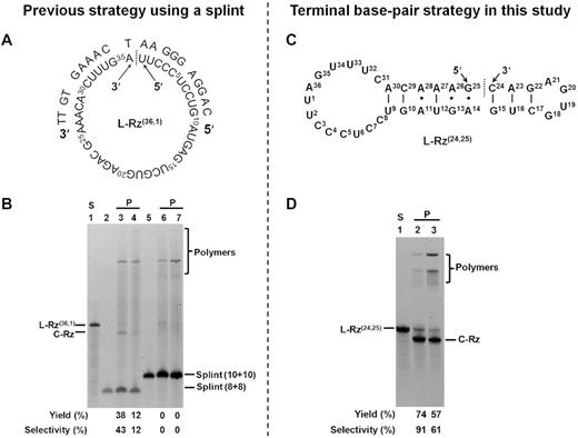 图注:Rnl2通过常规方法(A和B)或新方法(C和D)制备c-erbB-2特异性锤头状核酶环。