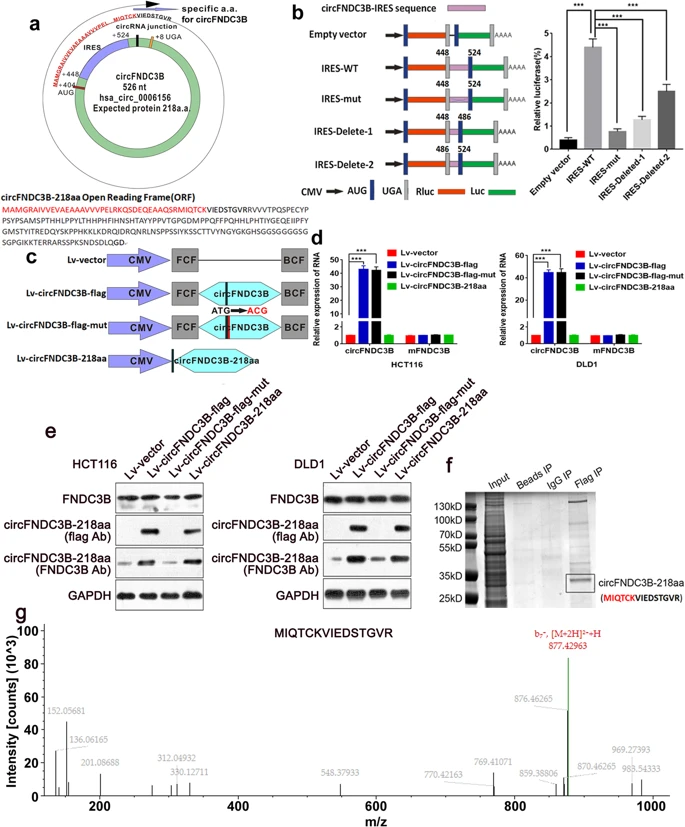 结肠癌(CC)是一种常见的恶性肿瘤。该研究发现circFNDC3B在多种癌症中发挥生物学功能。但是,尚不清楚circFNDC3B编码的潜在蛋白是否参与CC的致癌作用。研究者使用Sanger序列和RNase R消化测定法确认circFNDC3B的存在,并使用定量实时PCR评估circRNA的表达。然后进行荧光原位杂交(FISH)研究circFNDC3B的定位。使用LC-MS / MS对circFNDC3B编码的蛋白质进行鉴定。通过CCK8分析,集落形成分析,transwell分析,伤口愈合分析和动物实验评估了circFNDC3B-218aa对增殖,侵袭和迁移的功能。RNA测序和western blot用于鉴定由circFNDC3B-218aa调控的基因。最后,进行了葡萄糖代谢相关的测定,以进一步研究circFNDC3B-218aa的功能。结果表明:CircFNDC3B主要位于细胞质中,而在CC细胞系和组织中表达水平减少。circFNDC3B表达低的患者的OS(P = 0.0014)比高表达的患者短。此外,circFNDC3B抑制CC细胞的增殖,侵袭和迁移。circFNDC3B可以编码一种新型蛋白质circFNDC3B-218aa。此外,circFNDC3B-218aa而非circFNDC3B抑制了CC的增殖,侵袭和迁移。另外,体内实验暗示circFNDC3B-218aa上调对CC进展显示出抑制作用。通过RNA测序,蛋白质印迹和葡萄糖代谢相关的测定,结果发现circFNDC3B-218aa抑制Snail的表达,并随后促进FBP1在CC中的肿瘤抑制作用。新型circFNDC3B-218aa可以作为肿瘤抑制因子和潜在的生物标志物,可以为CC提供潜在的治疗靶点。