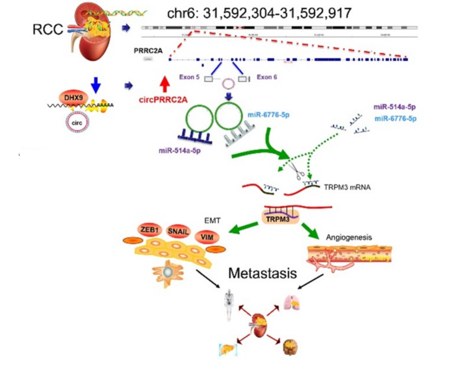 该研究主要聚焦circRNAs在肾细胞癌(RCC)中的机制功能。在这项研究中,作者旨在鉴定出可调节RCC上皮-间质转化(EMT)的新型circRNA分子,并确定其调控机制和临床意义,通过circRNA芯片筛选和qRT-PCR验证到circPRRC2A。在体外和体内均评估了circPRRC2A在RCC转移中的作用。结果发现,在RCC患者中,circPRRC2A的表达增加与晚期临床阶段和较差的生存率呈正相关。分子机理实验结果表明,circPRRC2A通过海绵化miR-514a-5p和miR-6776-5p防止了TRPM3(一种组织特异性癌基因)的降解。此外,circPRRC2A促进RCC患者的肿瘤EMT和侵袭性。这些发现提示circPRRC2A可能被用作RCC患者的治疗和预后靶标。