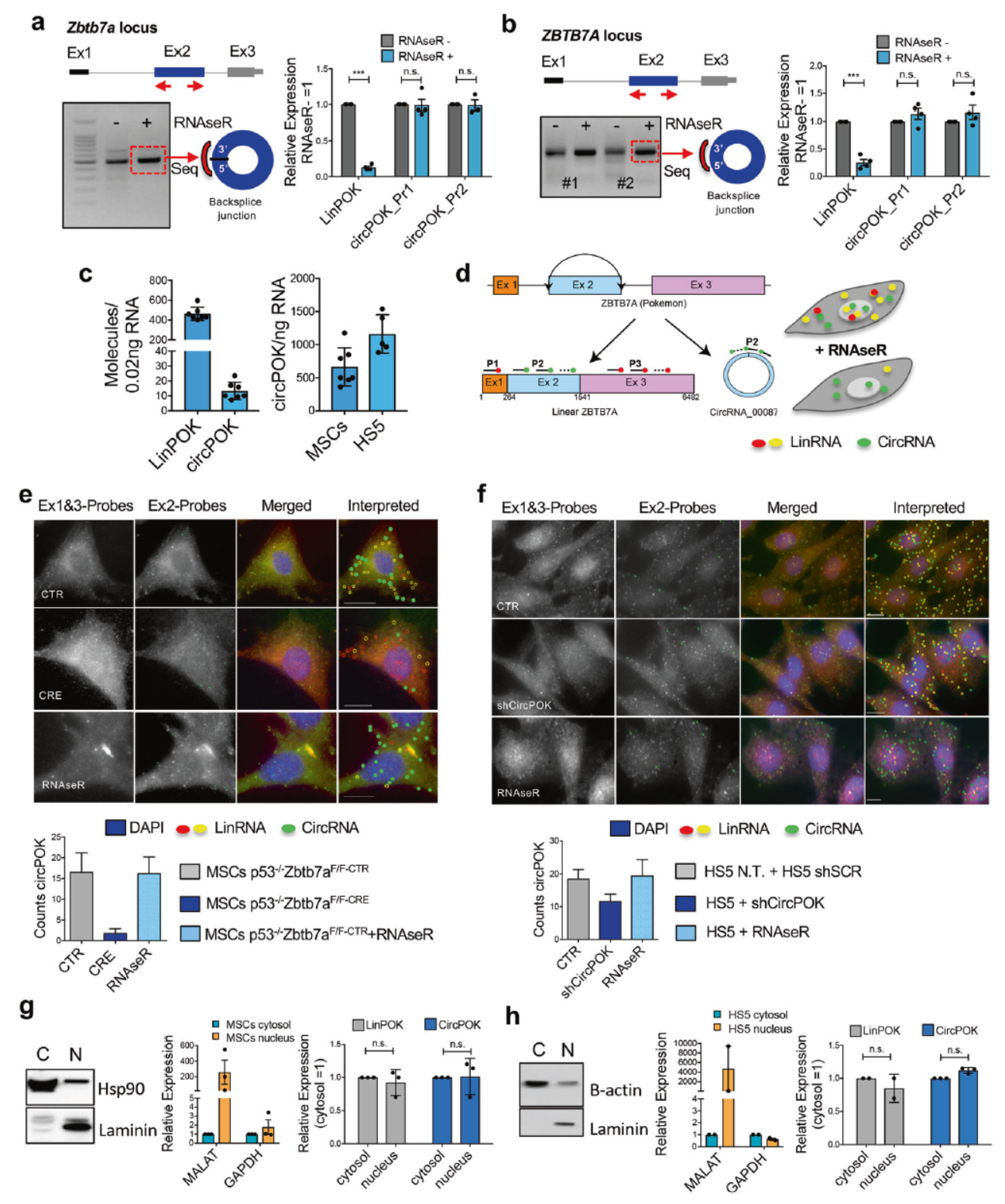 为分析circPOK的细胞定位,作者设计了一种新的原位杂交体系:circFISH。该技术的原理是针对circPOK的区域(第二外显子)部分设计为绿色标记的探针,Zbtb7a基因 的外显子1和3的探针设计为红色标记。如果所杂交的分子是LinPOK,它可同时被绿色和红色探针杂交,因此可表现为绿色与红色共定位的信号,而当杂交的分子是circPOK,就只能显示绿色。通过双色荧光拍照后即可找出circPOK和LinPOK的定位信息。为确认该杂交体系信号的可靠性,作者还在杂交实验中增加了RNase R消化的对照,证明所获得的信号是circPOK。