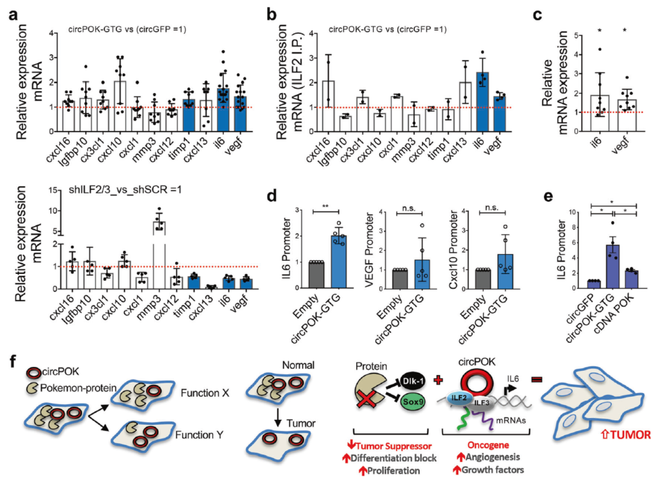 最后,作者描绘了circPOK与Pokemon蛋白分别发挥功能的模型:细胞中可以同时表达circPOK与Pokemon蛋白,但会存在细胞之间分布比例的差异,circPOK有结合并促进ILF2/ILF3复合物促进IL-6等基因表达的能力,而Pokemon蛋白具有抑制Dlk-1和SOX9的能力。这样在Pokemon蛋白多的细胞中,细胞增殖被抑制,反之,在circPOK多的细胞中,一些促癌的基因被表达放大,因此在细胞群体中呈现生存优势,最终诱导细胞群发生癌变。