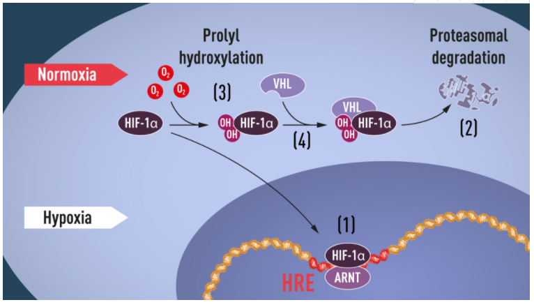 今年获奖的这个信号通路可以用下图概括:在正常氧浓度条件下(Normoxia),氧气可促进HIF-1α的羟基化,随后被VHL识别并介导多聚泛素化随后被蛋白酶体降解。但低氧条件时(Hypoxia),HIF-1α的羟基化程度减弱,因而得以保留,HIF-1α转移入核,与ARNT结合到靶基因启动子区的HRE元件,调控下游基因的转录表达。