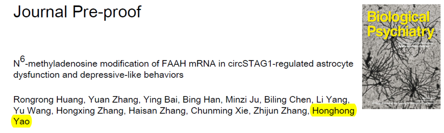1. Huang, R., et al., N(6)-Methyladenosine Modification of Fatty Acid Amide Hydrolase Messenger RNA in Circular RNA STAG1-Regulated Astrocyte Dysfunction and Depressive-like Behaviors. Biol Psychiatry, 2020.