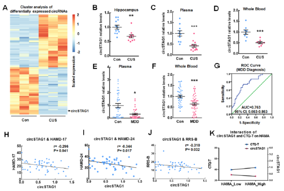circSTAG1由STAG1基因的2-5外显子反向剪切形成。相对于对照组,CUS模型小鼠的海马区,血浆和全血中circSTAG1均明显降低,但STAG1基因的mRNA变化不明显。circSTAG1似乎是脑组织特异性表达的分子,在心脏,肝脏,脾脏,肺和肾脏中表达都很低。MDD患者血清和全血中circSTAG1表达丰度均显著下降,ROC分析的AUC值可达0.763。circSTAG1的表达与评估抑郁症的几种指标均表现出显著的 负相关。