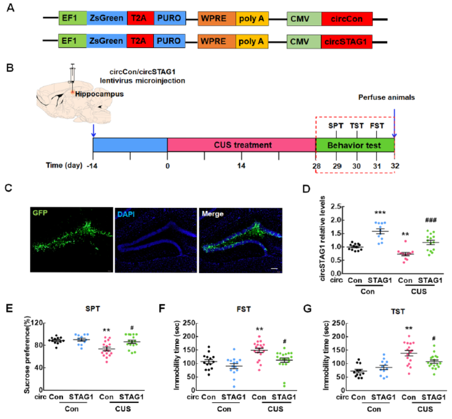 通过海马区注射过表达circSTAG1的AAV载体,作者分析了circSTAG1在CUS抑郁症模型小鼠体内的作用。结果显示,过表达circSTAG1能够显著改善抑郁症样行为。