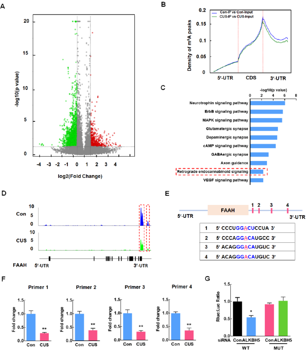 meRIP-seq分析表明,CUS处理后很多RNA的m6A修饰发生了变化。修饰位点集中在mRNA的ORF终止密码子和3’UTR区。针对修饰差异显著的基因进行通路分析。在富集分析的结果中,作者找到了FAAH基因,该基因存在两个m6A修饰 Peak,均在3’UTR区。SRAMP分析表明有四个潜在的m6A修饰位点,分别设计QPCR引物,然后分析meRIP后片段化产物丰度,结果显示,四个位点在CUS组均有显著下降。荧光素酶报告基因分析结果表明干扰ALKBH5后野生型序列的RNA会明显被降解,但m6A修饰位点突变后这一变化消失。