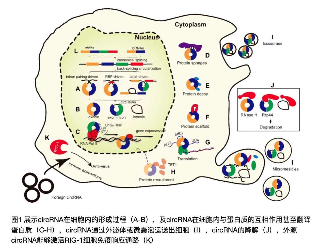 目前认为,circRNA除了作为miRNA分子海绵(miRNA sponges)外,在生物体内扮演的功能包括:蛋白质分子海绵(protein sponges),蛋白诱捕陷阱(decoys),蛋白质支架(scaffolds),蛋白质招募(recruiters),甚至翻译产生蛋白质。