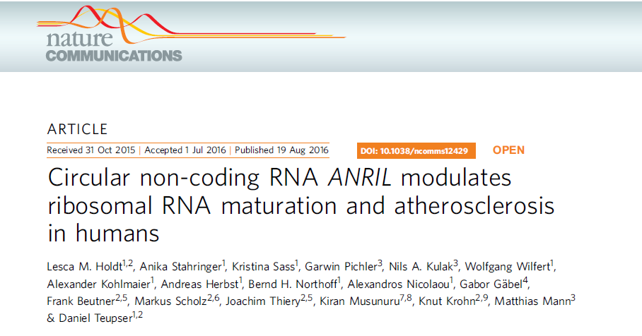 - Holdt LM, Stahringer A, Sass K, et al. Circular non-coding RNA ANRIL modulates ribosomal RNA maturation and atherosclerosis in humans. Nat Commun. 2016 Aug 19;7:12429. doi: 10.1038/ncomms12429.
