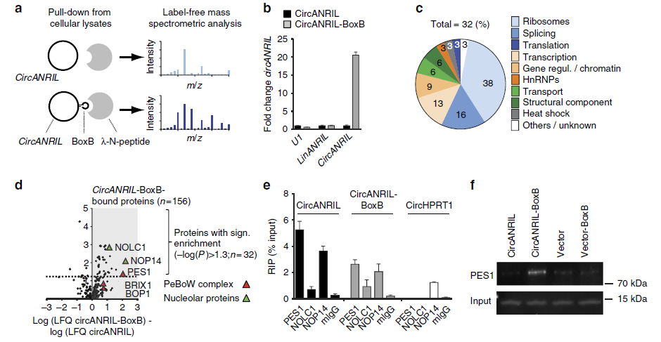 由于linANRIL曾被报道具有结合蛋白的能力,作者尝试circRNA pull-down进行蛋白组筛选鉴定circANRIL可能结合的蛋白。通过在HEK293中过表达含有发夹RNA BoxB序列标签的circANRIL(BoxB序列不影响circANRIL的环化结构),利用λN-peptide与发夹RNA BoxB序列的高亲和力,用结合λN-peptide的磁珠,可直接捕获与circANRIL结合的蛋白后,进行质谱分析蛋白组。RT-qPCR证明RNA pulldown产物中富集circANRIL,该方法特异而有效。质谱分析结果显示存在32种结合蛋白,主要富集的蛋白参与核糖体的生物合成、组装和RNA剪切的调节等生理过程。qPCR-RIP实验和circRNA pull-down后WB实验证实了circANRIL结合 PES1,而不是NOP14。由于PES1对PeBoW复合物功能至关重要,抑制该复合物会导致不成熟rRNA亚型的累积。过表达circANRIL会造成前rRNA 36S 和32S的明显累积,造成核仁应激反应(核仁变得更多和更小),促进P53在核仁中的聚集和被激活。