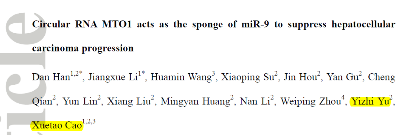 1. Han, D., et al., Circular RNA MTO1 acts as the sponge of miR-9 to suppress hepatocellular carcinoma progression. Hepatology, 2017.