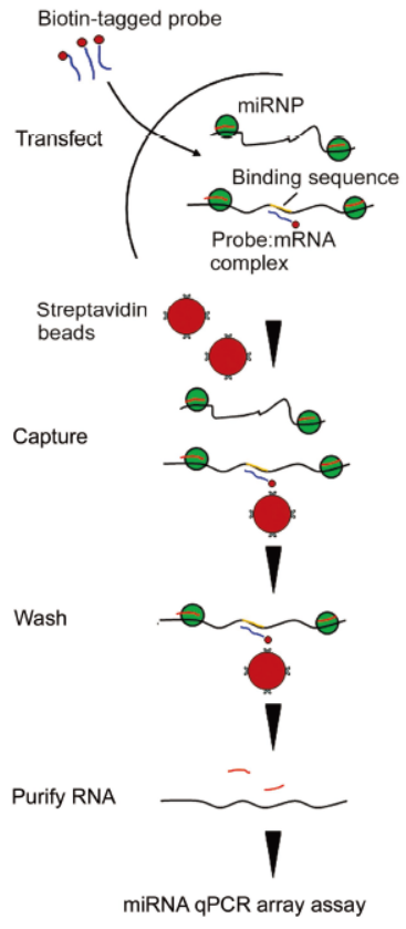 细胞培养与探针转染:细胞接种至10cm培养皿中,培养48h,细胞保持在对数生长期为佳。避免过满。生物素标记的探针和非特异性空白对照探针按200 nM浓度转染,37℃, 5% CO2培养条件。