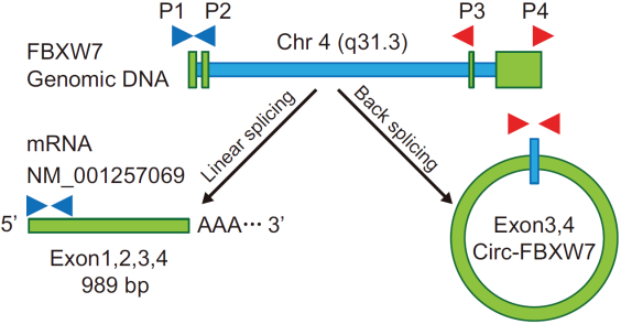 图3 通过PCR扩增和Sanger测序确定FBXW7的exon3和exon4经反向剪切形成620nt的circRNA,而不是circBase里收录hsa_circ_0001451的1227nt(Yibing Y et al., 2018)。