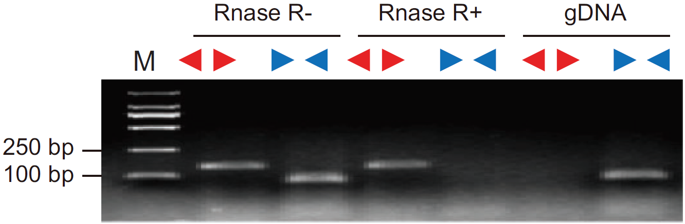 图6 RNase R消化后分别以Divergent Primer和Convergent Primer检测cDNA样品。RNase R+组中Divergent Primer有条带,Convergent Primer无条带;RNase R-组中Divergent Primer和Convergent Primer都有条带,表明检测的基因呈环形,且耐受RNase R消化(Yibing Y et al., 2018)。