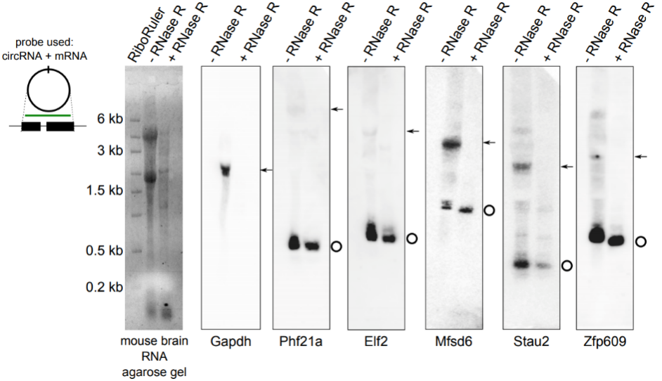 图8 将2 µg mouse total RNA进行RNase R消化,以3U/µg 于37℃孵育15分钟,加入10%线虫RNA作为外参后纯化回收,消化产物直接电泳显示RNase R+组中28S/18S条带变淡。使用同时检测circRNA和mRNA的探针进行Northern blot实验,结果显示RNase R+组检测不到线性的Gapdh、Phf21a、Elf2、Mfsd6、Stau2或Zfp609,可以检测到对应的circRNA,表明mRNA被消化,而circRNA耐受消化(Rybak-Wolf, A. et al., 2015)。