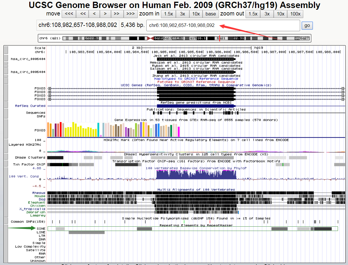 图为hsa_circ_0006404在基因组上的位置,红色箭头处可以手动输入以调整上下游延伸的长度,绿色箭头指示SINE行中即为可能存在的Alu元件(或其他重复元件),点击灰框进去可以查看详细的注释信息和序列。
