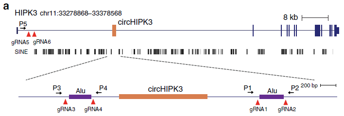 一种情况是敲除circRNA侧翼的Alu元件。例如circHIPK3有特别长的flanking introns,敲除侧翼的Alu元件后不影响对应的mRNA表达,这种敲除也是成功的。但大多数circRNA侧翼的Alu元件都不止一个,靶标敲除哪一个Alu,会不会影响mRNA或其他线性RNA的表达,在实验设计时都很难确定。