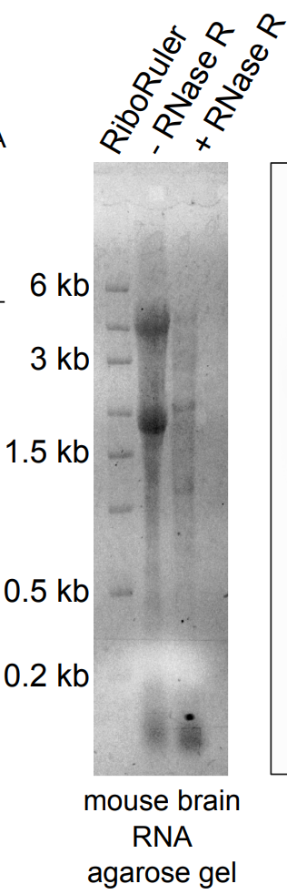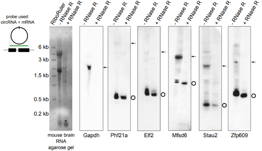 图4 以3U RNase R/µg RNA 进行RNase R消化15分钟,电泳显示RNase R(+)组中28S/18S条带变淡。使用同时检测circRNA和mRNA的探针进行Northern blot实验,结果显示RNase R(+)组检测不到线性的Gapdh、Phf21a、Elf2、Mfsd6、Stau2或Zfp609,可以检测到对应的circRNA,表明mRNA被消化,而circRNA耐受消化(Rybak-Wolf, A. et al., 2015)