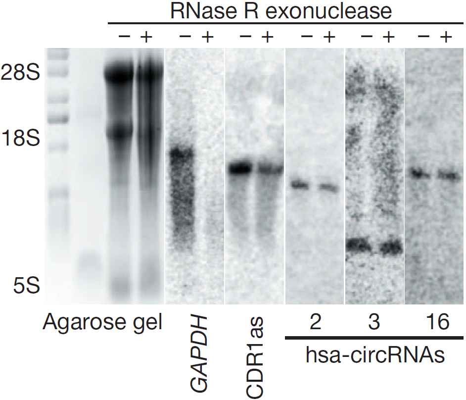 图5 RNase R消化产物电泳显示RNase R(+)组中28S/18S/5S条带变淡。Northern blot检测显示RNase R(+)组中无线性GAPDH的条带,CDR1as和hsa-circRNA 2/3/16能检测到条带,表明线性RNA被消化,而circRNA耐受消化(Memczak S et al., 2013)
