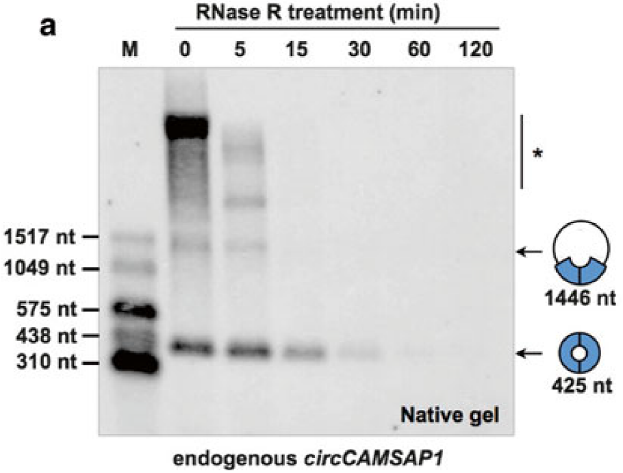 图8 RNase R消化0-120 min,Northern blot检测显示circCAMSAP1在15 min时就明显被消化(Zhang Y et al., 2016)
