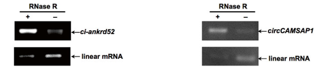 图10 RNase R消化后进行PCR检测,与RNase R(-)组相比,RNase R(+)组中linear mRNA条带变淡,表明被消化;RNase R(+)组中ci-ankrd52和circCAMSAP1条带变亮,表明被富集(Zhang Y et al., 2016)