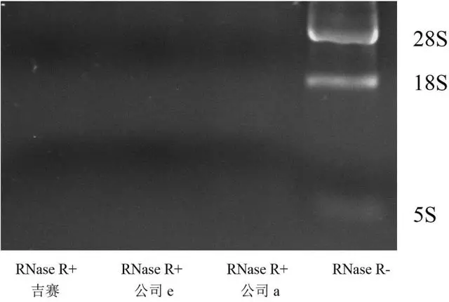 Total RNA经RNase R消化后进行电泳检测,预期RNase R+组28/18/5S条带变淡或不可见(注意区分RNA降解)。