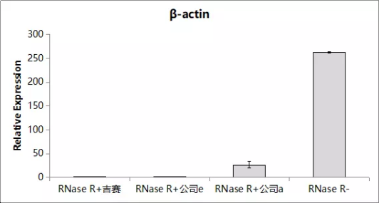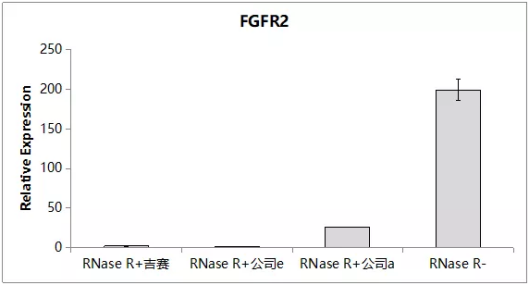 参考如下结果:将RNase R加入到total RNA中,消化反应后进行RT-qPCR检测,结果显示RNase R+组β-actin和FGFR2的丰度都明显降低,表明RNase R可消化线性RNA。