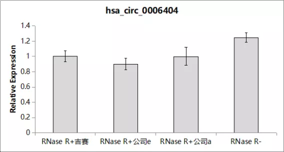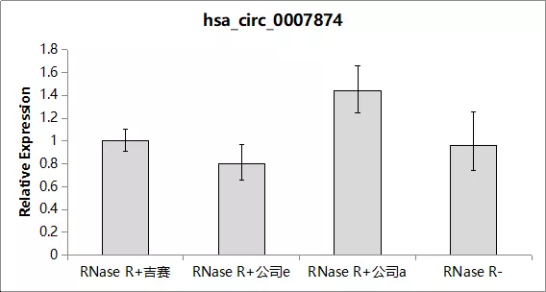 参考如下结果:将RNase R加入到total RNA中,消化反应后进行RT-qPCR检测,结果显示RNase R+组hsa_circ_0007874和has_circ_0006404的丰度基本不变,表明环形RNA耐受RNase R的消化。