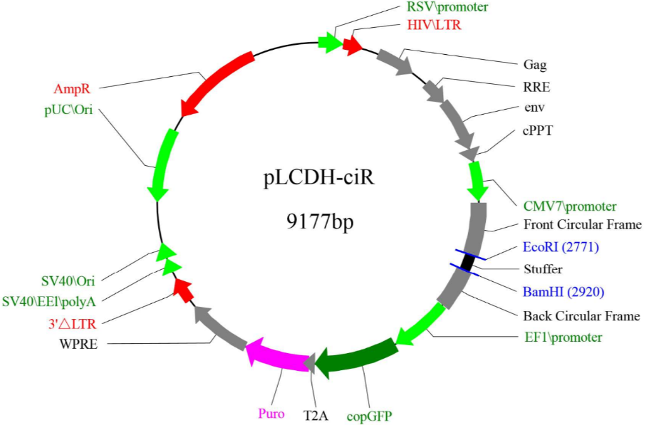 - 克隆载体构建简单。实验只需以PCR扩增目的环状RNA序列,经过酶切连接到载体上,简单快捷。