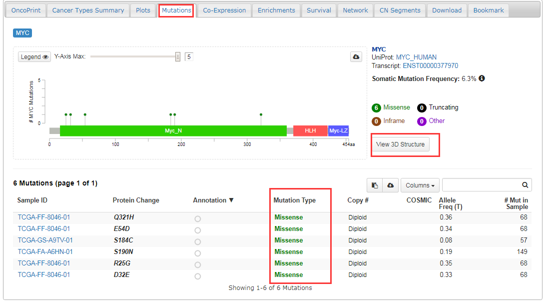 1. 点开“mutations”项,可查看MYC在DLBCL肿瘤病人中的基因突变的具体情况,还可查看myc蛋白的3D结构;