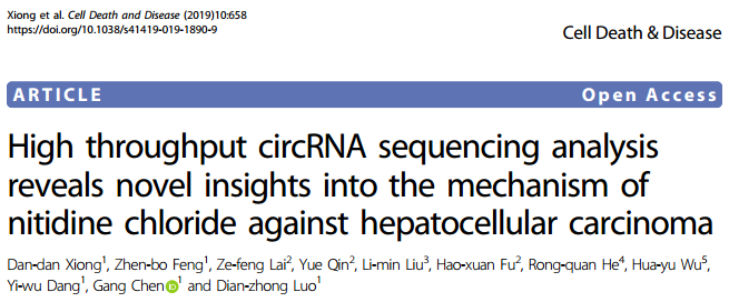 9月10日,Cell Death & Disease杂志(IF=5.959,中科院JCR二区)在线发表一篇题为“High throughput circRNA sequencing analysis reveals novel insights into the mechanism of nitidine chloride against hepatocellular carcinoma”的研究论文。该文章的通讯作者为广西医科大学的罗殿中教授和陈罡教授。
