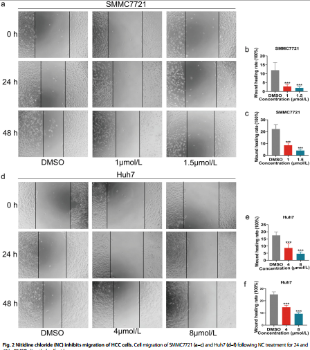 为了确定NC对肝细胞癌细胞迁移的影响,作者进行了伤口愈合实验,发现NC处理以时间和剂量依赖性方式抑制SMMC7721和Huh7细胞的迁移。