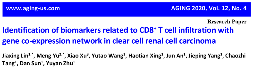Lin J, Yu M, Xu X, et al. Identification of biomarkers related to CD8+ T cell infiltration with gene co-expression network in clear cell renal cell carcinoma[J]. Aging (Albany NY), 2020, 12(4): 3694.