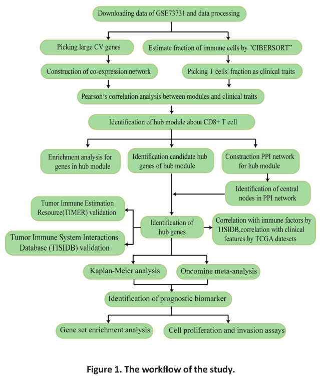 在临床科研中,我们结合TCGA和GEO在线数据库中的肿瘤表达谱数据进行免疫浸润分析,对研究问题的解读和湿实验的指导,可起到事半功倍的作用。目前国际上也发表了不少这方面以生信分析为主湿实验为辅的研究论文。下面我们以近期在Aging (Albany NY)杂志(影响因子:5.515分)发表的一篇文章为例,给大家展示从转录组数据挖掘与肿瘤免疫微环境相关分子标记物的分析思路。