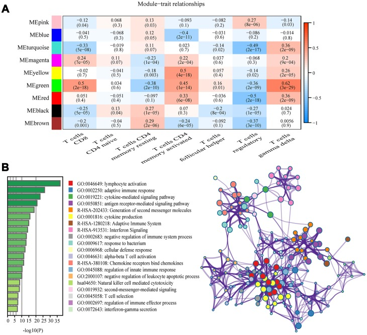 WGCNA分析得到基因表达模块与肿瘤浸润免疫细胞亚型形状关联关系,在这九个模块中,绿色模块与T细胞CD8(CD8 + T细胞)(R2 = 0.5,P = 2e-18),CD4 激活记忆T细胞(R2 = 0.45,P = 1e-14),伽马δT细胞(R2 = 0.62,P = 3e-29)高度相关。黄色模块显示与CD4 激活记忆T细胞相关(R2 = 0.5,P = 4e-18)。其他模块与T细胞之间的相关性小于0.5。因此重点关注显示与CD8 + T细胞相关的绿色模块,将其识别为核心模块。接下来,使用网络工具“Matascape”分析该模块中包含的基因,进行信号通路和生物学过程富集分析。20个最显著富集的都是与免疫相关的通路,而三个最富集的是淋巴细胞激活,适应性免疫应答和细胞因子介导的信号通路。