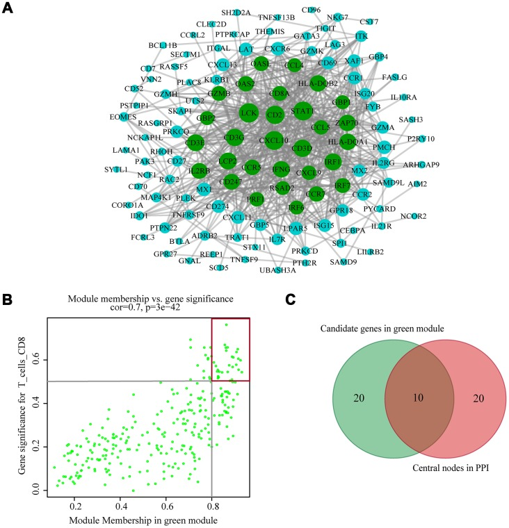 图3注:hub基因的鉴定。(A)来自绿色模块的基因的PPI网络分析。连接的节点数越多,则节点越大。绿色节点表示具有15个以上连接的中央节点。(B)绿色模块中基因的散点图。每个绿色点表示一个基因,红色框中的点表示模块reliability > 0.7 和connectivity > 15的基因。(C)基于PPI和共表达网络之间的重叠分子,选择为Hub基因。