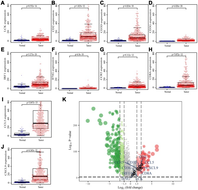 图5注:TCGA的转录数据中的hub基因的差异表达。(A)LCK,蓝点代表正常组织,红点代表肿瘤组织。y轴显示基因的表达值。(B)CD2。(C)CD3D。(D)CD3G。(E)IRF1。(F)IFNG。(G)CCR5。(H)CD8A。(I)CCL5。(J)CXCL9。(K)差异表达基因的火山图。红点表示高表达基因,绿点表示低表达基因,黑圈表示hub基因。