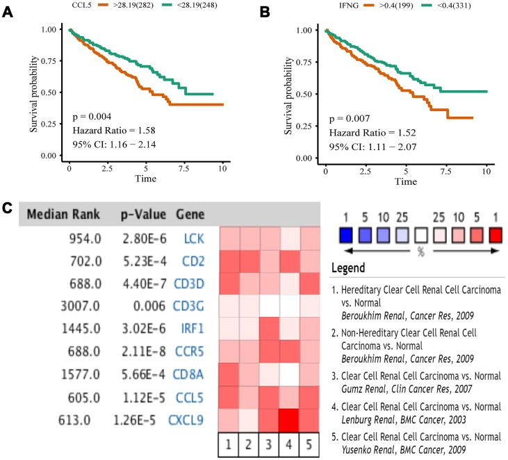 图7注:Kaplan-Meier生存分析和Oncomine meta分析。(A)CCL5的整体生存分析。(B)IFNG的整体生存分析。(C)来自Oncomine数据集的基因表达的meta分析。彩色方块代表五个数据集中基因的中位数(相对于正常组织)。红色表示高表达,蓝色表示低表达。